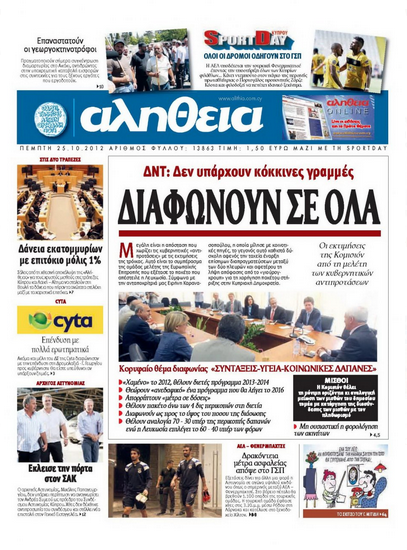 «Διαφωνούν σε όλα» είναι ο τίτλος του κύριου θέματος της εφημερίδας «Αλήθεια» που γράφει ότι , σύμφωνα με πληροφορίες από τις Βρυξέλλες, μεγάλη είναι η απόσταση που χωρίζει τις κυβερνητικές αντιπροτάσεις με τις εκτιμήσεις της Τρόικας και ότι κύριο θέμα διαφωνίας είναι οι συντάξεις, το σύστημα ασφάλισης και περίθαλψης και οι κοινωνικές δαπάνες. Σε άλλο θέμα η «Α» γράφει ότι μετά τις χθεσινές αποκαλύψεις για τα δάνεια και τα επιτόκια αξιωματούχων της Τράπεζας Κύπρου και της Λαϊκής, υπήρξε λαϊκή απαίτηση τα στοιχεία να δημοσιοποιηθούν ενώ η Βουλευτής Ειρήνη Χαραλαμπίδου υπέβαλε αίτημα για κατάθεση των στοιχείων στη Βουλή. Αλλού η εφημερίδα αναφέρει ότι εγείρονται πολλά ερωτήματα για την επένδυση της Cyta στη Δρομολαξιά, για την οποία, όπως γράφει, διαφώνησαν και μέλη του ΔΣ της Αρχής.