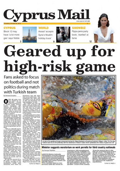 «Ετοιμοι για το κρίσιμο παιγνίδι» είναι ο τίτλος της αγγλόγλωσσης “Cyprus Mail” που αναφέρεται στον αποψινό υψηλού κινδύνου αγώνα ΑΕΛ-Φενερμπαχτσέ και τις εκκλήσεις όλων οι φίλαθλοι να συμπεριφερθούν με αθλητοπρέπεια. Αλλού αναφέρεται στις δηλώσεις του Τζον Τόμιτς, διευθυντή της Νoble στην Κύπρο ότι στο οικόπεδο 12 ίσως υπάρχουν πολύ περισσότερα αποθέματα φυσικού αερίου. Επίσης η εφημερίδα αναφέρεται στις δηλώσεις της Υπουργού εργασίας περί μορατόριουμ στις προσλήψεις ατόμων από τρίτες χώρες.