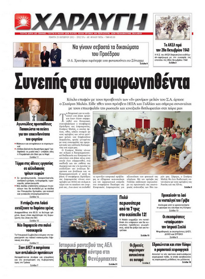 Η «Χαραυγή» υπό τον τίτλο «Συνεπής στα συμφωνηθέντα» γράφει στο κύριό της θέμα ότι ο υποψήφιος Σταύρος Μαλάς ξεκίνησε κύκλο επαφών με τους πρεσβευτές των «5» του Συμβουλίου Ασφαλείας και ότι επαναβεβαίωσε την πρόθεσή του να πολιτευτεί στη βάση αρχών και όσων έχουν συμφωνηθεί στο Κυπριακό. Αλλού αναφέρεται στις δηλώσεις του Προέδρου Χριστόφια ο οποίος απαντώντας στις αντιδράσεις για το διορισμό του Ανδρέα Κυριάκου στη θέση του Υπαρχηγού της Αστυνομίας κάλεσε όλους να κάνουν σεβαστά τα δικαιώματά του όπως προκύπτουν από το Σύνταγμα. Επίσης η «Χ» προβάλλει τις δηλώσεις του Διευθυντή της Νoble στην Κύπρο για τα αποθέματα στο οικόπεδο 12 και τις πρόσθετες γεωτρήσεις που θα γίνουν.