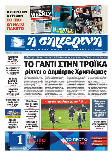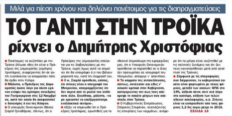 Η «Σημερινή» στεγάζει το δημοσίευμά της υπό τον τίτλο «Το γάντι στην Τρόικα ρίχνει ο Δημήτρης Χριστόφιας» και αναφέρεται σε χθεσινές δηλώσεις του Προέδρου της Δημοκρατίας ότι είναι πανέτοιμος να συζητήσει με την Τρόικα και ότι σε αυτήν εναπόκειται πότε θα κατέλθει στο νησί. Φιλοξενούνται και δηλώσεις του ΥΠΟΙΚ, του Κυβερνητικού Εκπροσώπου και κομμάτων. Αλλού η εφημερίδα κάνει αναφορά στο αποψινό παιγνίδι στο ΓΣΠ και γράφει για μεγάλη πρόκληση για την ΑΕΛ. Επίσης η «Σ» αναφέρεται στην καθυστέρηση που παρατηρείται στο διορισμό προέδρου του ΓΕΣΥ γράφοντας ότι αν δεν πληρωθεί η θέση, δεν μπορούν να ληφθούν αποφάσεις για τις διαδικασίες εφαρμογής του σχεδίου.