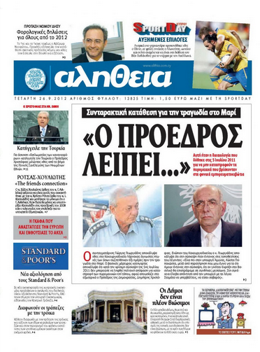 Η «Αλήθεια», υπό τον τίτλο «Ο Πρόεδρος λείπει…», γράφει ότι σύμφωνα με τα όσα κατέθεσε ο συνταγματάρχης Γεωργιάδης στο Κακουργιοδικείο Λάρνακας, αυτή ήταν η δικαιολογία που δόθηκε στις 5 Ιουλίου 2011 για να μην καταστραφούν τα πυρομαχικά που βρίσκονταν στα φονικά εμπορευματοκιβώτια. Αλλού, η «Α» γράφει ότι οι Δήμοι δεν είναι πλέον βιώσιμοι, ενώ οι δύο μεγάλοι Δήμοι Λευκωσίας και Λεμεσού χαρακτηρίζονται ήδη χρεοκοπημένοι. Ακόμη, αναφέρεται σε κάθετη διαφωνία των κυπριακών τραπεζών με δυο μέτρα που προτείνει η Τρόικα αναφορικά με την αύξηση των ιδίων κεφαλαίων των τραπεζών και τον περιορισμό του χρόνου εκποίησης των υποθηκευμένων ακινήτων στον ενάμισι χρόνο.
