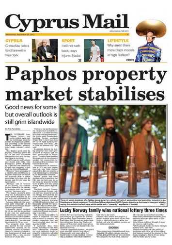 Η αγγλόγλωσση εφημερίδα “Cyprus Mail” αναφέρει στον κύριο τίτλο της ότι η «Αγορά ακινήτων της Πάφου σταθεροποιείται», προσθέτοντας ότι σύμφωνα με τα στοιχεία της Κεντρικής Τράπεζας, το ενδιαφέρον των Κινέζων εξηγεί μερικώς τα σημάδια σταθεροποίησης της αγοράς, αν και η πτώση στα ακίνητα παγκύπρια φτάνει το 5,9%. Ακόμη η εφημερίδα αναφέρεται στις δηλώσεις του Αρχιεπισκόπου Κύπρου για μετακίνηση μερικών τάφων στο Κοιμητήριο Αγ. Κωνσταντίνου και Ελένης που τοποθετήθηκαν σε διάδρομο παραπλήσιο αυτών των πεσόντων της εισβολής. Επίσης, γράφει ότι η Υπουργός Εξωτερικών έθεσε το θέμα της απελευθέρωσης του υπόπτου για τη δολοφονία Ισαάκ στον αναπληρωτή ΥΠΕΞ της Κιργισίας Kuseinovich, κατά τη διάρκεια συνάντησης στη Νέα Υόρκη.