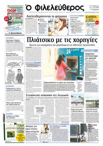 Ο «Φιλελεύθερος», στο πρώτο του θέμα αναφέρεται σε «Πλιάτσικο με τις χορηγίες» και γράφει ότι ο οικονομικός-διαχειριστικός έλεγχος του οίκου PricewaterhouseCoopers, με απόφαση του ΔΣ του ΚΟΑ, έφερε στο φως περιπτώσεις καταχρήσεως χιλιάδων ευρώ και φοροδιαφυγής σε αθλητικές Ομοσπονδίες. Αλλού γράφει ότι οι Υπουργοί Άμυνας της Γαλλίας, Γερμανίας, Βρετανίας συζητούν σήμερα και αύριο στη Λευκωσία το ενδεχόμενο συγχώνευσης των δύο ευρωπαϊκών κολοσσών της παγκόσμιας πολεμικής αεροπορίας, της EADS και ΒΑΕ Systems. Η εφημερίδα γράφει επίσης ότι ο διαγνωστικός έλεγχος των δανειακών χαρτοφυλακίων των τραπεζών, αξίας 65 δις περίπου, ανατέθηκε από την Κεντρική τράπεζα και την Τρόικα στον αμερικανικό οίκο Primco.