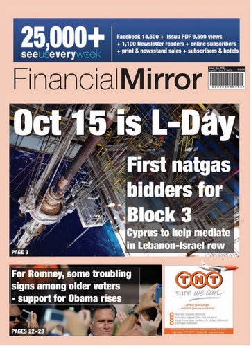 Η εβδομαδιαία οικονομική εφημερίδα “Financial Mirror” γράφει ότι η έναρξη των διαπραγματεύσεων με τις ενδιαφερόμενες για αδειοδότηση εταιρείες στα τεμάχια της ΑΟΖ ξεκινά στις 15 Οκτωβρίου, σύμφωνα με το Διευθυντή Ενέργειας Σόλωνα Κασίνη. Επίσης αναφέρει ότι δεν υπάρχει τίποτα νεότερο για τις 600 απολύσεις στη Λαϊκή. Αλλού, η εφημερίδα αναφέρει ότι οι εισπράξεις του Τμήματος Εσωτερικών προσόδων σημείωσαν αύξηση 3% τους πρώτους 8 μήνες του 2011, σε σύγκριση με την αντίστοιχη περσινή περίοδο.