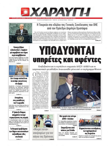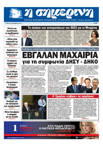 «Έβγαλαν μαχαίρια για τη συμφωνία ΔΗΣΥ – ΔΗΚΟ» είναι ο πρωτοσέλιδος τίτλος της «Σημερινής», η οποία αναφέρει ότι η δημοσιοποίηση του εγγράφου συμφωνίας ανάμεσα στα δύο κόμματα για το Κυπριακό προκάλεσε σφοδρές αντιπαραθέσεις ανάμεσα στα κόμματα και τα επιτελεία. Επίσης, η «Σ» γράφει για τη χθεσινή ομιλία του Προέδρου Χριστόφια ενώπιον της Γενικής Συνέλευσης του ΟΗΕ, ο οποίος αναφέρθηκε σε παραβίαση της κοινής δέσμευσης από την πλευρά του Ντερβίς Έρογλου να συνεχιστούν οι συνομιλίες από εκεί που είχαν μείνει, και υπαναχώρηση από τις συγκλίσεις που επιτεύχθηκαν επί Ταλάτ. Αλλού, η «Σ» γράφει ότι κόκκινες γραμμές για το ΑΚΕΛ αποτελούν το θέμα της ΑΤΑ και του 13ου μισθού, σύμφωνα με το σκληρό πυρήνα των αντιπροτάσεων του ΑΚΕΛ ενόψει της διαπραγμάτευσης με την Τρόικα.