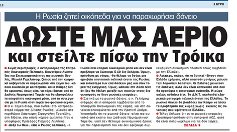 «Ο Φιλελεύθερος», κάτω από τον τίτλο «Ξεκίνησε το πάρε – δώσε» γράφει ότι σε βαθιά νερά έχουν εισέλθει οι διαπραγματεύσεις Κύπρου – Τρόικας, επικαλούμενος πληροφορίες από τις Βρυξέλλες σύμφωνα με τις οποίες η διαπραγμάτευση προχωρά, αλλά υπάρχει ακόμη δουλειά που πρέπει να γίνει. Σε άλλο του θέμα ο «Φ» γράφει ότι τεράστιο θέμα διαπλοκής εγείρεται για τις σχέσεις πολιτικών και κομμάτων με τραπεζικά ιδρύματα, προσθέτοντας ότι η ΕΔΕΚ οδηγεί το θέμα στη Βουλή εκτάκτως. Γράφει επίσης ότι ο Υπουργός Οικονομικών Βάσος Σιαρλή κατέβαλε χθες προσπάθεια να αποποιηθεί των ευθυνών που του καταλογίζει έγγραφο της Κεντρικής σε ότι αφορά το σκάνδαλο με τα αξιόγραφα.