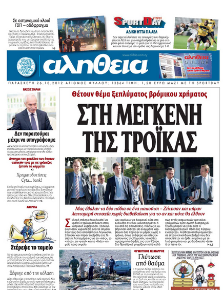 Η «Αλήθεια» τιτλοφορεί το κύριο θέμα της «Στη μεγκένη της Τρόικας» και γράφει ότι σκληρή είναι η στάση της Τρόικας έναντι της Κυβέρνησης και ότι δεν αφήνουν ούτε στο ελάχιστο να διαφανεί αν είναι ικανοποιημένοι ή όχι από τις απαντήσεις στα ερωτήματά τους. Σε άλλο της θέμα επικαλείται κύκλους σύμφωνα με τους οποίους ο Υπουργός Οικονομικών Βάσος Σιαρλή δεν σκοπεύει να παραιτηθεί μέχρι να υπογραφεί το μνημόνιο και αναφέρει ότι όλες οι παρατάξεις ζητούν να ανοίξει ο φάκελος των σχέσεων των τραπεζών με τα κόμματα. Αλλού γράφει ότι το ταμείο για το ανεργιακό στέρεψε και ότι θα μεταφερθούν 50 εκ.ευρώ από το Λογαριασμό Συμπληρωματικών Συντάξεων στο Λογαριασμό Παροχών Ανεργίας για να αντιμετωπιστούν οι ανάγκες από τη ραγδαία αύξηση του αριθμού των ανέργων.