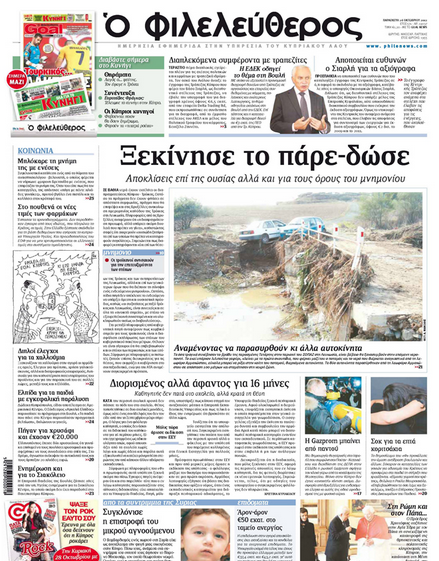 «Ο Φιλελεύθερος», κάτω από τον τίτλο «Ξεκίνησε το πάρε – δώσε» γράφει ότι σε βαθιά νερά έχουν εισέλθει οι διαπραγματεύσεις Κύπρου – Τρόικας, επικαλούμενος πληροφορίες από τις Βρυξέλλες σύμφωνα με τις οποίες η διαπραγμάτευση προχωρά, αλλά υπάρχει ακόμη δουλειά που πρέπει να γίνει. Σε άλλο του θέμα ο «Φ» γράφει ότι τεράστιο θέμα διαπλοκής εγείρεται για τις σχέσεις πολιτικών και κομμάτων με τραπεζικά ιδρύματα, προσθέτοντας ότι η ΕΔΕΚ οδηγεί το θέμα στη Βουλή εκτάκτως. Γράφει επίσης ότι ο Υπουργός Οικονομικών Βάσος Σιαρλή κατέβαλε χθες προσπάθεια να αποποιηθεί των ευθυνών που του καταλογίζει έγγραφο της Κεντρικής σε ότι αφορά το σκάνδαλο με τα αξιόγραφα.