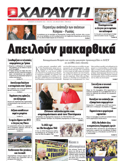 Η «Χαραυγή» προβάλλει το κύριο θέμα της με τίτλο «Απειλούν μακαρθικά» και γράφει ότι ο ΔΗΣΥ προαναγγέλλει «μακαρθικές» μεθόδους και καταρράκωση των θεσμών αν ανέλθει στην εξουσία και αναφέρεται στις δηλώσεις του Αντιπροέδρου του ΔΗΣΥ Ιωνά Νικολάου για τον νέο Υπαρχηγό της Αστυνομίας. Σε άλλο της θέμα προβάλλει με πρωτοσέλιδη φωτογραφία τη συνάντηση χθες του Προέδρου της Δημοκρατίας με τον Πάπα Βενέδικτο ΙΣΤ’, αναφέροντας ότι ο Πρόεδρος ενημέρωσε τον Πάπα για το Κυπριακό. Αλλού γράφει για τις επαφές του υποψήφιου για την Προεδρία Σταύρου Μαλά με το Ρώσο και τον Κινέζο Πρέσβη, και αναφέρεται σε περαιτέρω ανάπτυξη των σχέσεων Κύπρου – Ρωσίας.