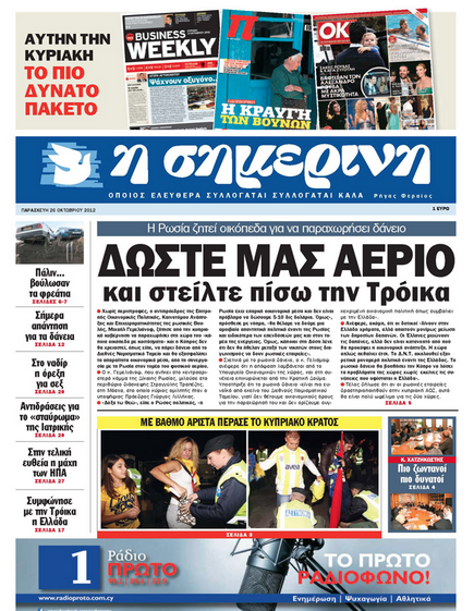 «Η Σημερινή», με κύριο τίτλο «Δώστε μας αέριο» γράφει ότι η Ρωσία ζητεί οικόπεδα για να παραχωρήσει δάνειο και επικαλείται προς αυτό δηλώσεις στο περιθώριο διάσκεψης Στρογγυλής Τραπέζης στη Μόσχα του Αντιπροέδρου της Επιτροπής Οικονομικής Πολιτικής της ρωσικής Βουλής ότι «δεν είναι πρόβλημα να δώσουμε 5 – 10 δις δολάρια. Όμως, θα θέλαμε να δούμε μια αμοιβαία απαντητική πολιτική έναντι της Ρωσίας και ειδικότερα των επενδύσεών μας και στον τομέα της ενέργειας». Σε άλλο της θέμα η εφημερίδα γράφει ότι με βαθμό άριστα πέρασε το κυπριακό κράτος σε ότι αφορά στην αστυνόμευση του χθεσινού αγώνα ΑΕΛ – Φενέρμπαχτσε. Αλλού αναφέρει πως τα βουλωμένα φρεάτια προκάλεσαν το χείμαρρο στην περιοχή του ΣΟΠΑΖ.