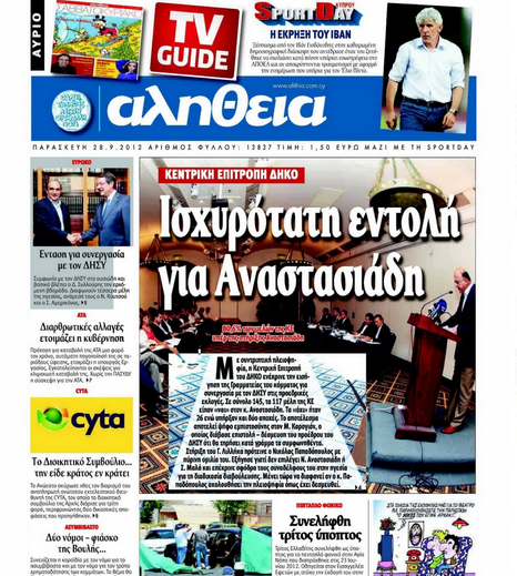 Η «Αλήθεια» στο κύριο της θέμα με τίτλο «Ισχυρότατη εντολή για Αναστασιάδη», γράφει ότι με συντριπτική πλειοψηφία, η Κεντρική Επιτροπή του ΔΗΚΟ ενέκρινε την εισήγηση της Γραμματείας του Κόμματος για συνεργασία με τον ΔΗΣΥ στις προεδρικές εκλογές. Αλλού, γράφει ότι το Ανώτατο ακύρωσε χθες τον διορισμό του αναπληρωτή ανώτατου εκτελεστικού διευθυντή της Cyta, τον οποίο το διοικητικό συμβούλιο της Αρχής διόρισε για τρίτη φορά, περιφρονώντας δύο δικαστικές αποφάσεις που προηγήθηκαν. Σε άλλο θέμα της από την πρώτη σελίδα, η εφημερίδα γράφει ότι πρόταση για καταβολή της ΑΤΑ μια φορά τον χρόνο, αυτόματη παγοποίησή της σε περιόδους ύφεσης, ετοιμάζει η Υπουργός Εργασίας.