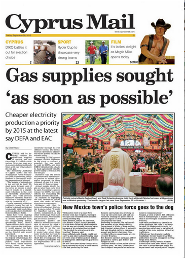 Η αγγλόγλωσση εφημερίδα “Cyprus Mail”, στο κύριο της θέμα με τίτλο «Επιδιώκεται η προμήθεια φυσικού αερίου το συντομότερο δυνατό» γράφει ότι η Κύπρος θα προχωρήσει με τη διαδικασία της προσκλήσεως υποβολής προσφορών για τη βραχυπρόθεσμη προμήθεια φυσικού αερίου που δεν θα υπερβαίνει τα 1,2 δισεκατομμύρια κυβικά μέτρα ετησίως ως λύση ανάγκης μέχρι την μέχρι την εξόρυξη και αξιοποίηση του δικού της φυσικού αερίου. Η εφημερίδα δημοσιεύει, επίσης, φωτογραφικό στιγμιότυπο από τη χθεσινή καθιερωμένη λειτουργία που τελέστηκε από δύο καθολικούς ιερείς στο Μόναχο για το μεγαλύτερο φεστιβάλ παγκοσμίως, το «Oktoberfest». Αλλού αναφέρεται στη χθεσινή συνεδρία της Κεντρικής Επιτροπής του ΔΗΚΟ για τη λήψη της τελικής απόφασης κόμματος για τις προεδρικές εκλογές.