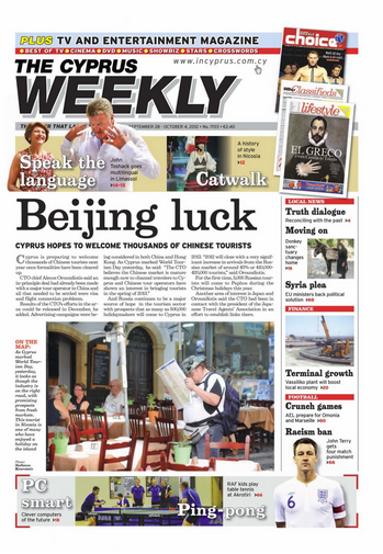 Η εβδομαδιαία αγγλόγλωσση εφημερίδα “Cyprus Weekly”, γράφει στο κύριο της θέμα ότι η Κύπρος ετοιμάζεται να υποδεχθεί χιλιάδες τουρίστες από την Κίνα τον επόμενο χρόνο, αφού πρώτα επιλυθούν τα προβλήματα της έκδοσης βίζας και της αεροπορικής σύνδεσης, σύμφωνα με όσα δήλωσε χθες ο Πρόεδρος του ΚΟΤ Αλέκος Ορουντιώτης. Αλλού, γράφει ότι σύμφωνα με μια ανεξάρτητη έρευνα η επιλεκτική μνήμη και η μονόπλευρη θεώρηση της ιστορίας αποτρέπουν την επίτευξη λύσης στο κυπριακό πρόβλημα. Σε άλλο θέμα της, η εφημερίδα γράφει ότι οι Υπουργοί Άμυνας της ΕΕ ζητούν την εξεύρεση πολιτικής λύσης στη συριακή κρίση.