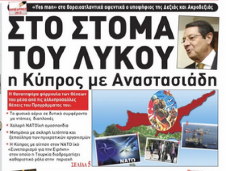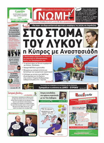 Η εβδομαδιαία εφημερίδα η «Γνώμη», στο κύριο της θέμα με τίτλο «Στο στόμα του λύκου η Κύπρος με Αναστασιάδη», αναφέρεται στο έγγραφο συνεργασίας του ΔΗΣΥ – ΔΗΚΟ και γράφει ότι οι μη αναφορές σε Διζωνική στο έγγραφο δίνουν πλέον μια πιο στέρεα μορφή στην αιωρούμενη χαλαρή ομοσπονδία. Αλλού γράφει ότι η Επιτροπή Οικονομικών της Βουλής, υπό την προεδρία του Νικόλα Παπαδόπουλου και τη στήριξη της «κυβερνώσας», δεν κάνει καμία βιαστική κίνηση να ανασύρει νομοσχέδια που αφορούν επιπλέον συνεισφορά του πλούτου και της μεγάλης κερδοφορίας. Γράφει, επίσης, ότι το αντιμνημονιακό μέτωπο τρομάζει ήδη το επιτελείο Αναστασιάδη – πλουτοκρατίας.