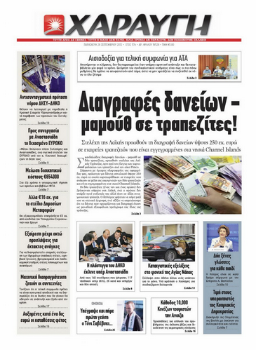 Η «Χαραυγή», στο κύριο της θέμα με τίτλο «Διαγραφές δανείων-μαμούθ σε τραπεζίτες!», γράφει ότι σκανδαλώδεις διαγραφές δανείων-μαμούθ σε δύο τραπεζίτες, προωθούν στελέχη της Λαϊκής Τράπεζας, πριν από τον έλεγχο των χαρτοφυλακίων των τραπεζών από τον οίκο Pimco. Αλλού, γράφει ότι ΔΗΣΥ-ΔΗΚΟ με πρόταση που κατατέθηκε χθες στη Βουλή θέλουν να λειτουργεί με νομοθεσία η Κρατική Εταιρεία Υδρογονανθράκων κατά παράβαση προνοιών του Συντάγματος. Η εφημερίδα, γράφει, επίσης, ότι τις τελευταίες δύο μέρες σημειώθηκαν καταιγιστικές εξελίξεις στα δύο μέτωπα του πενταπλού φόνου και της σχεδιαζόμενης δολοφονίας με στόχο τον Φάνο Καλοψιδιώτη στην Αγία Νάπα.