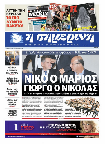 Η «Σημερινή», υπό τον τίτλο «Νίκο ο Μάριος, Γιώργο ο Νικόλας» γράφει ότι με συντριπτική πλειοψηφία (ποσοστό 80,6%), η Κεντρική Επιτροπή του ΔΗΚΟ αποφάσισε, λίγο μετά τα μεσάνυκτα, την υποστήριξη της υποψηφιότητας του Νίκου Αναστασιάδη. Αλλού, γράφει ότι προς την ολοκλήρωση της, με σημαντικές συγκλίσεις σε όλο το φάσμα της πολιτικής θεματολογίας, βαίνει η διαβούλευση ΔΗΣΥ και ΕΥΡΩΚΟ, με αντικείμενο την προοπτική συνεργασίας στις προεδρικές εκλογές. Σε άλλο θέμα της, η εφημερίδα γράφει ότι τα κόμματα κάλεσαν τον Υπουργό Οικονομικών στη Βουλή για να τα ενημερώσει για την κατάσταση της οικονομίας, τις προτάσεις της Τρόικας και τις αντιπροτάσεις της Κυβέρνησης.