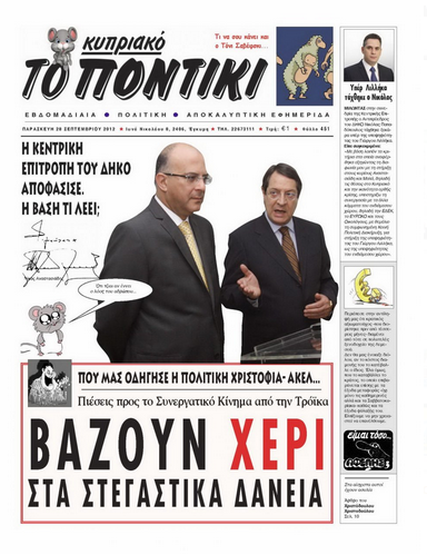 Η εβδομαδιαία εφημερίδα «Το κυπριακό Ποντίκι», στο κύριο του θέμα με τίτλο «Η Κεντρική Επιτροπή του ΔΗΚΟ αποφάσισε. Η βάση τι λέει;», αναφέρεται στη χθεσινή απόφαση της ΚΕ του Κόμματος για στήριξη της υποψηφιότητας Νίκου Αναστασιάδη στις επικείμενες προεδρικές εκλογές. Αλλού, γράφει ότι ο Αντιπρόεδρος του ΔΗΚΟ Νικόλας Παπαδόπουλος, μιλώντας στη συνεδρία της ΚΕ, τάχθηκε ξεκάθαρα υπέρ της υποψηφιότητας του Γιώργου Λιλλήκα. Σε άλλο θέμα της από την πρώτη σελίδα, η εφημερίδα γράφει ότι η Τρόικα θα επιφέρει δραματικές αλλαγές στην κοινωνική δομή, αν οι θέσεις της μετουσιωθούν σε κυπριακό μνημόνιο.