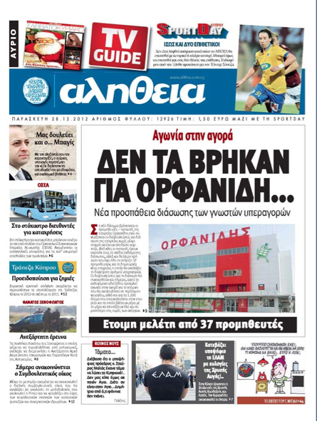 Η «Αλήθεια» στο κύριο της θέμα με τίτλο «Δεν τα βρήκαν για Ορφανίδη» γράφει ότι σε νέο δίλημμα βρίσκονται οι προμηθευτές – πιστωτές της εταιρείας Ορφανίδης, ενώ συνεχίζονται οι διαβουλεύσεις για διάσωση της εταιρείας χωρίς μέχρι στιγμής να έχουν αποδώσει καρπούς. Αλλού, η εφημερίδα γράφει ότι στο στόχαστρο για καταχρήσεις μπαίνουν εκ νέου τα ηγετικά στελέχη του ΟΣΕΛ και ότι αναμένονται εισαγγελικές αποφάσεις για τις κατ’ ισχυρισμό ατασθαλίες των τιμολογίων. Επίσης, αναφέρει ότι σημαντική αρνητική απόκλιση αναμένεται να παρουσιάσουν τα αποτελέσματα της Τράπεζας Κύπρου το 2012 σε σχέση με το 2011.