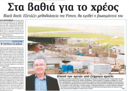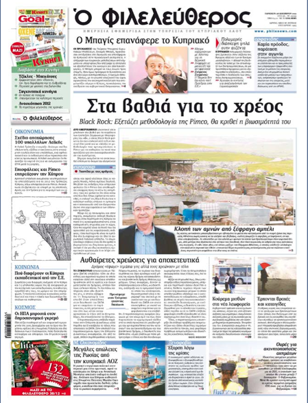 «Ο Φιλελεύθερος» με τίτλο «Στα βαθιά για το χρέος» γράφει ότι δύο αμερικανικοί ελεγκτικοί οίκοι μπαίνουν στα βαθιά για τα κεφάλαια των τραπεζών και ότι σύμφωνα με πληροφορίες του «Φ» ο οίκος Black Rock φαίνεται να έχει επιλεγεί από τη Συντονιστική Επιτροπή για να ελέγξει τη μεθοδολογία που χρησιμοποίησε η Pimco για να καθορίσει το ποσό που χρειάζεται για την ανακεφαλαιοποίηση του συστήματος. Αλλού, γράφει ότι οι προκλήσεις του Τούρκου Υπουργού Ευρωπαϊκών Υποθέσεων Εγκεμέν Μπαγίς προκάλεσαν αντιδράσεις στη Λευκωσία και επανέφεραν το Κυπριακό στην προεκλογική εκστρατεία. Αλλού, γράφει για αυθαίρετες χρεώσεις για αποχετευτικά στην Πάφο.