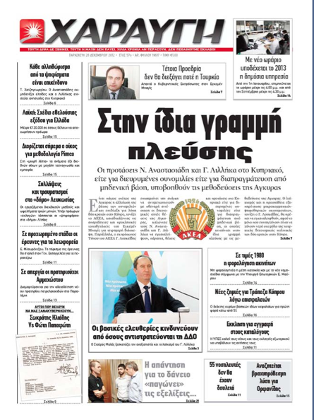 «Η Χαραυγή» με τίτλο «Στην ίδια γραμμή πλεύσης» γράφει ότι οι προτάσεις των υποψηφίων για την προεδρία, Ν. Αναστασιάδη και Γ. Λιλλήκα στο Κυπριακό είτε για διευρυμένες συνομιλίες είτε για διαπραγμάτευση από μηδενική βάση, υποβοηθούν τις μεθοδεύσεις της Αγκυρας. Αλλού, γράφει ότι ο Κυβερνητικός Εκπρόσωπος Στέφανος Στεφάνου δήλωσε ότι το κυπριακό κράτος διεξήγαγε μια καθόλα πετυχημένη προεδρία της ΕΕ και ότι τέτοια πετυχημένη προεδρία ποτέ δεν θα διεξάγει η Τουρκία, απαντώντας έτσι σε δηλώσεις του Τούρκου Υπουργού Εγκεμέν Μπαγίς. Επίσης, η εφημερίδα γράφει ότι από την 1η Ιανουαρίου επιμηκύνεται το ωράριο στη δημόσια υπηρεσία μέχρι τις 4μμ και τις 0430μμ από τον Σεπτέμβριο.