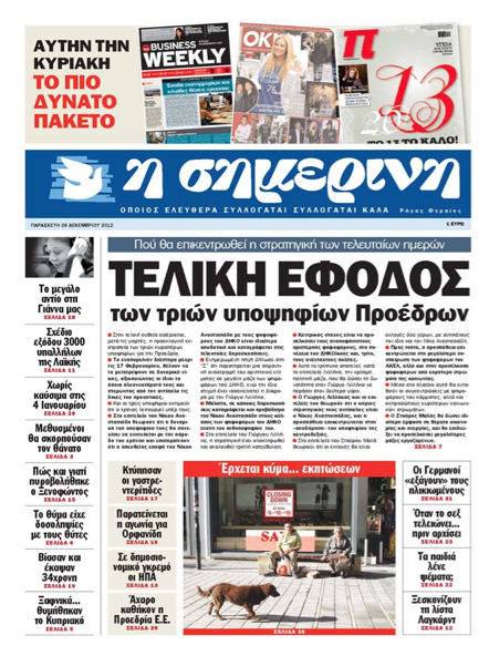 «Η Σημερινή» υπό τον τίτλο «Τελική έφοδος» αναφέρει ότι στην τελική ευθεία εισέρχεται μετά τις γιορτές η προεκλογική εκστρατεία των τριών κυριότερων υποψηφίων για την Προεδρία και ότι το εναπομείναν διάστημα μέχρι τις 17 Φεβρουαρίου θέλουν να το μετατρέψουν σε δυναμική νίκης, εκτιμώντας και οι τρεις ότι ο χρόνος λειτουργεί υπέρ τους. Σε άλλο της θέμα γράφει ότι η Λαϊκή Τράπεζα ανακοίνωσε σχέδιο εξόδου για τους 3,000 υπαλλήλους της στην Ελλάδα. Επίσης, αναφέρει ότι σε κλείσιμο των πρατηρίων βενζίνης στην Αμμόχωστο και μετά παγκύπρια προσανατολίζεται ο Σύνδεσμος Πρατηριούχων εάν δεν ανακληθεί η άδεια που έχει εκδοθεί για ανέγερση πρατηρίου στο Παραλίμνι.