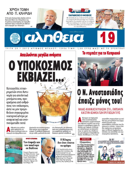 Η «Αλήθεια» στο κύριο της θέμα με τίτλο «Ο υπόκοσμος εκβιάζει», γράφει ότι η Αστυνομία λαμβάνει καταγγελίες από επιχειρηματίες για απειλητικά μηνύματα sms, προερχόμενα από ανθρώπους του υποκόσμου, ώστε να μην προμηθεύουν συγκεκριμένα νυκτερινά κέντρα με αναψυκτικά και οινοπνευματώδη ποτά. Αλλού, με τίτλο «Ο Ν. Αναστασιάδης έπαιζε μόνος του» γράφει για το χθεσινό ντιμπέιτ των τριών βασικών υποψηφίων με θέμα το Κυπριακό, αναφέροντας ότι «Μαλάς-Λιλλήκας βούλιαξαν στο παρελθόν και στην ασάφεια των προτάσεών τους». Σε άλλο της θέμα, γράφει ότι ο ΥΠΟΙΚ δεν ενίσταται στη διεξαγωγή έρευνας για θέματα βρώμικου χρήματος σχολιάζοντας δημοσίευμα της Financial Times.