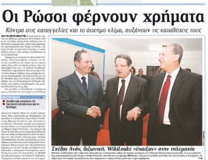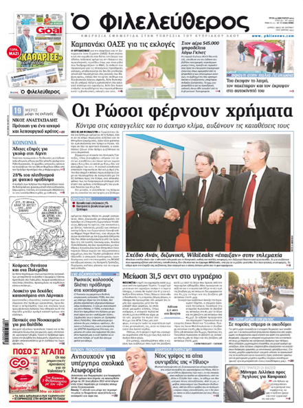 Ο «Φιλελεύθερος», υπό τον τίτλο «Οι Ρώσοι φέρνουν χρήματα», γράφει στο κύριο του θέμα πως οι καταθέσεις των ξένων στην Κύπρο αυξήθηκαν σημαντικά το 2012, κόντρα στις καταγγελίες και το άσχημο κλίμα. Γράφει, επίσης πως η Μόσχα παρουσιάζεται έτοιμη να παραχωρήσει βοήθεια προς την Κύπρο, σε συνεργασία με την ΕΕ, ενώ φαίνεται να επιθυμεί επέκταση του χρόνου αποπληρωμής του δανείου ύψους 2,5 δις ευρώ. Το δεύτερο θέμα της εφημερίδας, πλαισιωμένο με σχετικό φωτογραφία των τριών βασικών υποψηφίων, ήταν η χθεσινή τηλεμαχία, στην οποία κυριάρχησε το Σχέδιο Ανάν, η διζωνική και τα έγγραφα WikiLeaks. Σε άλλο του θέμα, γράφει ότι μειώνεται από την ερχόμενη Πέμπτη η τιμή του υγραερίου, κατά 31,5 σεντ.