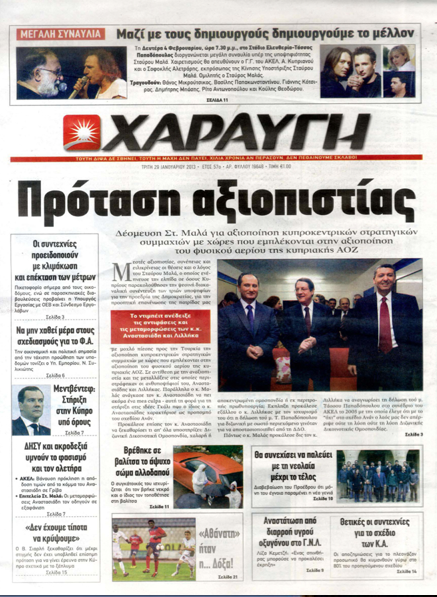Η «Χαραυγή», κάτω από τον τίτλο «Πρόταση αξιοπιστίας», γράφει στο κύριο της θέμα ότι το χθεσινοβραδινό ντιμπέιτ ανέδειξε τις αντιφάσεις και τις μεταμορφώσεις των κ. Αναστασιάδη και Λιλλήκα, ενώ ο λόγος του Σ. Μαλά ήταν μεστός, με συνέπεια, αξιοπιστία και ειλικρίνεια. Αλλού, γράφει για τη δέσμευση του Προέδρου Χριστόφια ότι μόνη έγνοια του παραμένει η νέα γενιά, και πως θα συνεχίσει να παλεύει με τη νεολαία μέχρι το τέλος. Σε άλλο της θέμα, η «Χαραυγή», γράφει ότι με πικετοφορία συνεχίζουν σήμερα τις κινητοποιήσεις τους οι οικοδόμοι, με τις συντεχνίες να προειδοποιούν με κλιμάκωση και επέκταση των μέτρων.