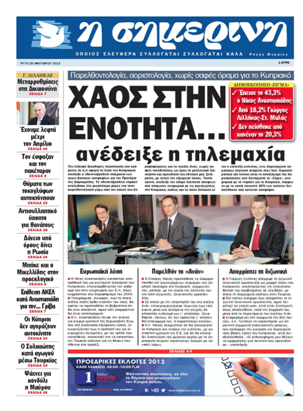 Η «Σημερινή» υπό από τον τίτλο «Χάος στην ενότητα ανέδειξε η τηλεμαχία», γράφει στο κύριο της θέμα ότι το χθεσινοβραδινό ντιμπέιτ, ανέδειξε την έλλειψη ξεκάθαρης στρατηγικής και οράματος σε ό,τι αφορά τη λύση του Κυπριακού, και αναλώθηκε στο μεγαλύτερο της μέρος στην παρελθοντολογία γύρω από την εποχή του δημοψηφίσματος και του Σχεδίου Ανάν. Αλλού γράφει για το άγριο φονικό με θύμα 25χρονο αλλοδαπό, το πτώμα του οποίου εντοπίστηκε τεμαχισμένο σε ταξιδιωτική βαλίτσα στο χώρο αποσκευών αυτοκινήτου. Σε άλλο θέμα γράφει για τις διαβεβαιώσεις του ΥΠΟΙΚ ότι υπάρχουν χρήματα για τις ανάγκες του κράτους μέχρι τον Απρίλιο.