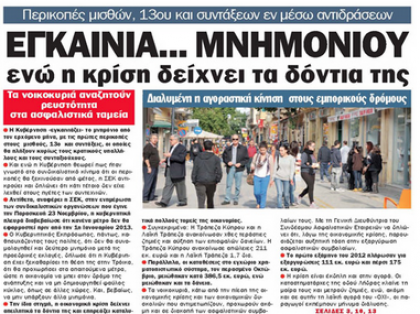 Με τον τίτλο «Εγκαίνια…Μνημονίου ενώ η κρίση δείχνει τα δόντια της» στεγάζει το κύριό της θέμα η «Σημερινή» που γράφει ότι τον Δεκέμβριο αρχίζουν οι πρώτες περικοπές σε μισθούς και συντάξεις ενώ την ίδια ώρα τα νοικοκυριά αναζητούν ρευστότητα στα ασφαλιστικά ταμεία. Φιλοξενούνται μεταξύ άλλων οι δηλώσεις του ΚΕ και η ανακοίνωση της ΣΕΚ που διαψεύδει ότι τα κόμματα και οι εταίροι ήταν ενήμεροι. Αλλού η εφημερίδα αναφέρεται στην συνάντηση των ηγεσιών ΠΑΣΥΔΥ, ΣΕΚ και ΠΕΟ χθες και στην απόφασή τους να μην γίνουν απεργίες. Σε άλλο θέμα η «Σ» γράφει ότι στελέχη του ΕΥΡΩΚΟ στηρίζουν την υποψηφιότητα του Γιώργου Λιλλήκα.