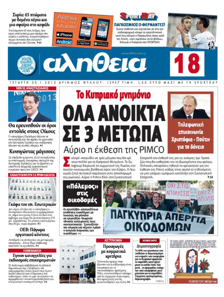 Η «Αλήθεια», κάτω από τον τίτλο «Όλα ανοικτά σε 3 μέτωπα», γράφει στο κύριο της θέμα ότι σε σκληρό παιχνίδι παίζεται σε τρία μέτωπα που θα κρίνουν πολλά για το Κυπριακό Μνημόνιο, καθώς το Eurogroup διερευνά τη συμμετοχή της Ρωσίας στο πακέτο οικονομικής βοήθειας, η Λευκωσία ζητά πενταετή παράταση στην αποπληρωμή του ρωσικού και η Pimco δίνει αύριο στη Συντονιστική Επιτροπή την έκθεση της για τις ανάγκες των Τραπεζών. Αλλού, γράφει για «πόλεμο στις οικοδομές», με τους εργολάβους να καταγγέλλουν επιθέσεις οικοδόμων με λοστούς και ρόπαλα σε εργοτάξια κατά την απεργία. Σε άλλο της θέμα, γράφει ότι τελευταίες μέρες στην εξουσία και η Κυβέρνηση κάνει ό,τι μπορεί να «τακτοποιήσει» ημετέρους και ότι ανακοινώθηκαν προαγωγές στην Αστυνομία.