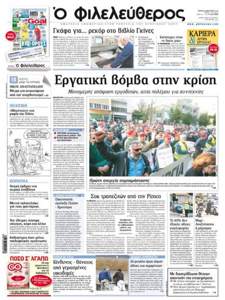Ο «Φιλελεύθερος» στο κύριο του θέμα με τίτλο «Εργατική βόμβα στην κρίση», γράφει ότι χαρακτήρα ωρολογιακής βόμβας προσλαμβάνουν οι εξελίξεις στις εργασιακές σχέσεις με την εργατική ειρήνη να κρέμεται πλέον από μια κλωστή, καθώς απειλείται γενίκευση της σύγκρουσης μετά την απόφαση των εργοδοτών για παγοποίηση του εργατικού κόστους στον ιδιωτικό τομέα. Αλλού, γράφει ότι το πρώτο ισχυρό σοκ φαίνεται να δέχθηκαν χθες οι τραπεζίτες μετά τη συνάντηση με την Pimco, βλέποντας ότι η ακτινογραφία των ισολογισμών τους περιλαμβάνει δυσάρεστες εκπλήξεις. Σε άλλο του θέμα γράφει ότι περίπου 450 χιλιάδες οικοδομές σε όλη την Κύπρο είναι γερασμένες και συνιστούν κίνδυνο, σύμφωνα με στοιχεία του ΕΤΕΚ.