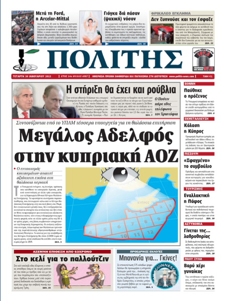 Ο «Πολίτης», υπό τον τίτλο «Μεγάλος Αδελφός στην κυπριακή ΑΟΖ», γράφει στο κύριο της θέμα ότι το Υπουργικό Συμβούλιο ενέκρινε τη Δευτέρα πρόταση του Υπουργείου Αμυνας μετά από συνεννόηση με άλλα τρία Υπουργεία, για τη δημιουργία Εθνικού Κέντρου Θαλάσσιας Επιτήρησης. Αλλού, γράφει ότι ο Πρόεδρος Χριστόφιας είχε χθες τηλεφωνική συνομιλία με το Ρώσο Πρόεδρο Βλαντιμίρ Πούτιν, κατά την οποία φαίνεται να συζητήθηκε το αίτημα των Ευρωπαίων εταίρων μας για παροχή νέας ρωσικής βοήθειας προς την Κύπρο, αλλά και να κλειδώσει το κυπριακό αίτημα για επέκταση της αποπληρωμής του ρωσικού δανείου ύψους 2,5 δις ευρώ. Σε άλλο του θέμα με τίτλο «Μπανανία για Γκίνες», γράφει για την επανεκτύπωση 575 χιλιάδων ψηφοδελτίων που θα προχωρήσει η Υπηρεσία Εκλογών μετά την ένσταση της Guinness World Records για τη χρήση του εμβλήματός της από τον Ανδρέα Ευστρατίου.