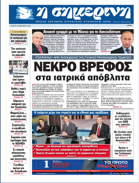 Η «Σημερινή» στο κύριο της θέμα με τίτλο «Νεκρό βρέφος στα ιατρικά απόβλητα», γράφει για την ανεύρεση εμβρύου, το οποίο γεννήθηκε την περασμένη Κυριακή, ευρισκόμενο στην 26η εβδομάδα της κύησης, σε χαρτοκιβώτιο στα ιατρικά απόβλητα του Γενικού Νοσοκομείου Λεμεσού. Σε άλλο της θέμα γράφει για την επόμενη μέρα της τηλεμαχίας των τριών βασικών υποψηφίων για την Προεδρία, και πως άπαντες θεωρούν εαυτούς ως νικητές της τηλεοπτικής αναμέτρησης για το Κυπριακό. Αλλού, γράφει ότι ανοικτός είναι ο δίαυλος επικοινωνίας μεταξύ της Ευρωπαϊκής Επιτροπής, του ΔΝΤ και της Ρωσίας, προκειμένου η Μόσχα να συμμετάσχει στη δανειοδότηση της Κύπρου στο πλαίσιο του Μνημονίου.