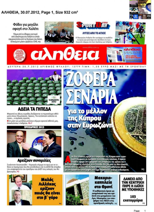 Η «Αλήθεια» στο πρωτοσέλιδό της με τίτλο «Ζοφερά σενάρια» γράφει ότι η παραμονή της Κύπρου στην ευρωζώνη κρέμεται από ‘δύο κλωστές’. Η πρώτη, σύμφωνα με την εφημερίδα αφορά την εφαρμογή του μνημονίου και η δεύτερη τις εξελίξεις στην Ελλάδα. Σε άλλο της θέμα η εφημερίδα ασχολείται με τους ολυμπιακούς αγώνες που πραγματοποιούνται στο Λονδίνο, αναφέροντας ότι τα περισσότερα αθλήματα διεξάγονται μπροστά σε άδειες κερκίδες. Προσθέτει επίσης αρκετοί Κύπριοι αθλητές αγωνίζονται σήμερα. Αλλού γράφει ότι αρχίζουν σήμερα οι συνομιλίες μεταξύ Αναστασιάδη και Καρογιάν, προσθέτοντας ότι η συνάντηση σήμερα έχει ως στόχο να τεθούν οι παράμετροι που θα καταδείξουν αν το ΔΗΚΟ θα στηρίξει την υποψηφιότητα του Προέδρου του ΔΗΣΥ στις Προεδρικές.