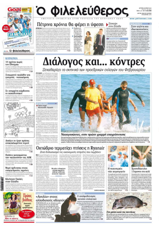 Με τίτλο «Διάλογος και … κόντρες», ο «Φιλελεύθερος» γράφει ότι ξεκαθαρίζει το σκηνικό των προεδρικών εκλογών στη βάση των δεδομένων που έχουν προκύψει από τις αποφάσεις του ΔΗΚΟ και της ΕΔΕΚ το Σάββατο. Η εφημερίδα γράφει ότι από την πρώτη επίσημη επαφή Καρογιάν – Αναστασιάδη εκτιμάται πως θα διαφανούν οι προοπτικές για στήριξη της υποψηφιότητας του από το ΔΗΚΟ. Αναφέρει επίσης ότι το ΔΗΚΟ έχει να αντιμετωπίσει και το ζήτημα αποτροπής ΑΚΕΛ και Γιώργου Λιλλήκα από την εξασφάλιση ψήφων της βάσης του ΔΗΚΟ. Σε άλλο της θέμα η εφημερίδα γράφει ότι τον Οκτώβριο τερματίζει τα τέσσερα δρομολόγια της από το αεροδρόμιο Λάρνακας η Ryanair, προσθέτοντας ότι επικαλούμενη δυσκολίες ζητά επαναδιαπραγμάτευση της συμφωνίας με ΚΟΤ ζητώντας διπλασιασμό της οικονομικής στήριξής της. Αλλού η εφημερίδα γράφει ότι στο Υπουργείο Οικονομικών θα πρέπει να εξεταστούν αντιπροτάσεις στην Τρόικα με στόχο να γίνουν μειώσεις αλλά με ομαλό τρόπο και να μην ανακοπεί η ανάκαμψη.