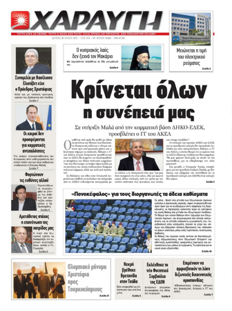 Η «Χαραυγή», με τίτλο «Κρίνεται όλων η συνέπειά μας» προβάλλει δήλωση του ΓΓ του ΑΚΕΛ χθες σχετικά με τις Προεδρικές και τις αποφάσεις ΔΗΚΟ – ΕΔΕΚ, ότι ‘ο καθένας από εμάς θα κριθεί με βάση τη συνέπεια των θέσεων που διατυπώνει διαχρονικά’. Παράλληλα, φιλοξενεί δήλωση του υποψήφιου Προέδρου Σταύρου Μαλά ότι οι Προεδρικές θα είναι εκλογές δύο γύρων. Αλλού γράφει ότι ο κυπριακός λαός δεν ξεχνά τον Μακάριο, αναφέροντας ότι με λαμπρότητα τελέσθηκε το 35ο μνημόσυνό του στην Παναγιά του Κύκκου χθες. Αλλού γράφει ότι ο Πρόεδρος Χριστόφιας είχε συνομιλία με τη Βασίλισσα Ελισάβετ, αλλά και με πολλούς αρχηγούς κρατών που βρίσκονται στο Λονδίνο περιλαμβανομένων του Βρετανού Πρωθυπουργού και του Ρώσου Πρωθυπουργού κατά την ειδική δεξίωση που παρέθεσε η Βασίλισσα για τους Ολυμπιακούς Αγώνες.