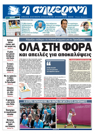 Η «Σημερινή» έχει τίτλο «Όλα στη φόρα» γράφει ότι ‘αμείλικτο πόλεμο εναντίον αλλήλων’ κήρυξαν χθες προεδρικοί υποψήφιοι και πολιτικά κόμματα για τις Προεδρικές. Αναφέρεται επίσης σε πληροφορίες για παραίτηση του Προέδρου Χριστόφια και προκήρυξης πρόωρων εκλογών για να μη χρεωθεί το ΑΚΕΛ το βάρος του μνημονίου. Προσθέτει ότι ο Κυβερνητικός Εκπρόσωπος δήλωσε ότι δεν μπορεί να τίθεται τέτοιο θέμα όταν ακόμη δεν είναι γνωστά τα μέτρα που θα προτείνει η Τρόικα, καθώς και ότι ο Αντρος Κυπριανού χαρακτήρισε σχετικά δημοσιεύματα ως ‘αποκυήματα φαντασίας’. Αλλού, γράφει για τους ολυμπιακούς αγώνες και τον παιχνίδι του Μάρκου Παγδατή, χθες, το οποίο διακόπηκε. Σε άλλο της θέμα η εφημερίδα αναφέρεται σε πολύνεκρες συγκρούσεις στη Συρία γράφοντας ότι νέος μέτωπο άνοιξε χθες στην επαρχία Ιντλίμπ που συνορεύει με την Τουρκία.