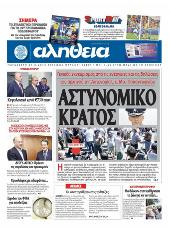 Η «Αλήθεια» στεγάζει το κύριό της θέμα υπό τον τίτλο «Αστυνομικό κράτος» και γράφει ότι επικρατεί γενικός εκνευρισμός από τις ενέργειες και δηλώσεις του Αρχηγού Αστυνομίας για τις κινηματογραφήσεις διαδηλώσεων καθώς και η απόφαση να προσαφθούν κατηγορίες μεταξύ άλλων για οχλαγωγία στους επικεφαλής των ποιμνιοτρόφων και πατατοπαραγωγών.Αλλού η εφημερίδα αναφέρεται στη συνεδρίαση της Τράπεζας Κύπρου, στις αποφάσεις που λήφθηκαν σε σχέση με διαρροές εγγράφων και στο διορισμό νέου προέδρου του ΔΣ μετά την παραίτηση Αριστοδήμου.Επίσης πρωτοσέλιδα η «Α» αναφέρεται στην συνάντηση ΔΗΣΥ-ΔΗΚΟ για τις προεδρικές εκλογές και γράφει ότι τα δύο μέρη συμφώνησαν στο πλαίσιο αρχών που θα διέπει τη νέα στρατηγική για διαχείριση του εθνικού θέματος.
