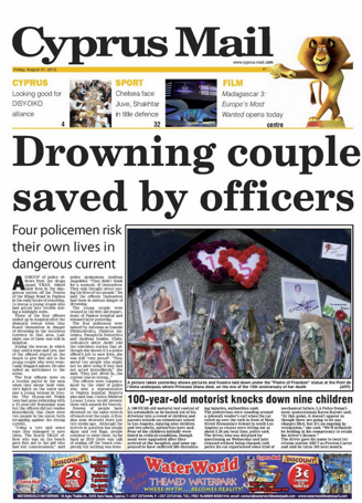 Η αγγλόφωνη “Cyprus Mail” στεγάζει το πρωτοσέλιδό της υπό τον τίτλο «Ζεύγος που κινδύνευε με πνιγμό σώθηκε από αστυνομικούς» και γράφει ότι τέσσερα μέλη της ΥΚΑΝ προσέτρεξαν να σώσουν τη ζωή νεαρού ζευγαριού που κινδύνεψε να πνιγεί χθες στην περιοχή Τάφοι των Βασιλέων στην Πάφο. Αλλού αναφέρεται στις αποφάσεις που λήφθηκαν στη συνάντηση ΔΗΣΥ-ΔΗΚΟ χθες για τις εκλογές. Επίσης στην εφημερίδα γίνεται πρωτοσέλιδη αναφορά σε περιστατικό στο Λος Αντζελες όπου ένας οδηγός 100 ετών έχασε τον έλεγχο του οχήματός του ενώ εξερχόταν από το γκαράζ του και κτύπησε σε ομάδα παιδιών και των γονέων τους έξω από δημοτικό σχολείο.