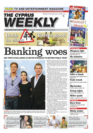 Τέλος η εβδομαδιαία αγγλόγλωσση εφημερίδα «The Cyprus Weekly» με τίτλο «Τραπεζική συμφορά» αναφέρεται στην ανακοίνωση των αποτελεσμάτων της Τράπεζας Κύπρου που κατέγραψε ζημιές και στον διορισμό νέου Προέδρου του ΔΣ. Αλλού προβάλλει δηλώσεις της ΥΠΕΞ ότι δεν θα αναληφθεί πρωτοβουλία για την Συρία στην άτυπη συνάντηση των ΥΠΕΞ των 27 στην Κύπρο. Επίσης στην εφημερίδα γίνεται πρωτοσέλιδη αναφορά στο συνέδριο των αποδήμων στην Κύπρο και τις δηλώσεις των ηγετών τους σε απάντηση αναφορών σε δημοσιεύματα ότι «κάθε χρόνο έρχονται , ξεκουράζονται, τρώνε και πίνουν και ζητούν χρήματα».