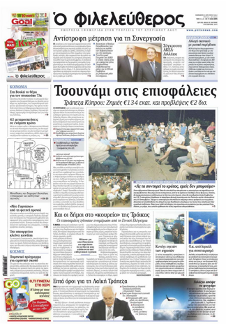 «Τσουνάμι στις επισφάλειες» τιτλοφορεί το κύριό του θέμα ο «Φιλελεύθερος» και γράφει ότι η Τράπεζα Κύπρου ανακοίνωσε αυξημένες ζημιές για το πρώτο εξάμηνο 134 εκατομμυρίων, αύξηση επισφαλειών και επανεκτίμηση για μεγαλύτερη κεφαλαιακή τρύπα. Αναφέρεται ακόμη στο διορισμό του Ανδρέα Αρτέμη στη θέση του Προέδρου του ΔΣ και στις αποφάσεις που λήφθηκαν για την πρόσφατη διαρροή εγγράφων της Τράπεζας. Αλλού ο «Φ» γράφει ότι η δεινή κατάσταση των Δήμων βρέθηκε κάτω από το μικροσκόπιο της Τρόικας που ζήτησε ενημέρωση από την γενική ελέγκτρια κατά την πρόσφατη επίσκεψή της στην Κύπρο. Επίσης η εφημερίδα αναφέρεται στην χθεσινή συνάντηση ΔΗΣΥ-ΔΗΚΟ και στις συγκλίσεις που σφραγίστηκαν στο Κυπριακό.