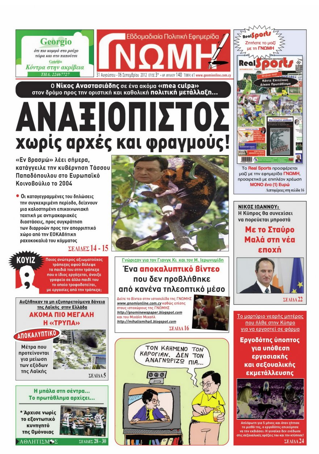 Η εβδομαδιαία εφημερίδα «Γνώμη» στεγάζει το πρωτοσέλιδό της με τίτλο «Αναξιόπιστος χωρίς αρχές και φραγμούς» και αναφέρεται στις δηλώσεις του Προέδρου του ΔΗΣΥ ότι ‘εν βρασμώ ψυχής’ κατήγγειλε το 2004 την Κυβέρνηση Τάσσου Παπαδόπουλου στο Ευρωκοινοβούλιο. Με την ένδειξη ‘αποκαλυπτικό’ η εφημερίδα γράφει αλλού ότι αυξήθηκαν τα μη εξυπηρετούμενα δάνεια της Λαϊκής στην Ελλάδα και ότι προτείνονται μέτρα για μείωση των εξόδων της. Επίσης στην «Γνώμη» γίνεται αναφορά σε υπόθεση εργασιακής και σεξουαλικής εκμετάλλευσης νεαρής μητέρας που ήρθε πριν από 5 μήνες στην Κύπρο και εργαζόταν σε φάρμα στην επαρχία Λάρνακας.