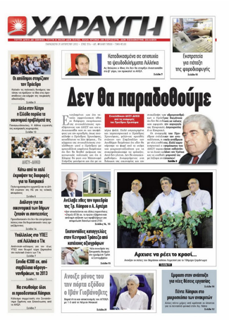 Η «Χαραυγή» τιτλοφορεί το κύριό της θέμα «Δεν θα παραδοθούμε» και γράφει ότι οι διάφοροι εκπρόσωποι της αντιπολίτευσης ενοχλήθηκαν από τις αναφορές του Προέδρου Χριστόφια στο συνέδριο των αποδήμων για την οικονομική κατάσταση και τα μέτρα που θα ληφθούν υπό το φως και του μνημονίου της Τρόϊκας. Αλλού αναφέρεται στις απαντήσεις του Εκπροσώπου του ΑΚΕΛ σε προχθεσινές αναφορές του Γιώργου Λιλλήκα για τον δεύτερο γύρο των προεδρικών εκλογών. Επίσης στην «Χ» γίνεται αναφορά πρωτοσέλιδα στην συνεδρίαση της Τράπεζας Κύπρου, τις ανακοινώσεις οικονομικών αποτελεσμάτων και τον διορισμό του νέου Προέδρου του ΔΣ.