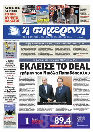 Υπό τον τίτλο «Εκλεισε το Deal ερήμη του Νικόλα Παπαδόπουλου» η «Σημερινή» αναφέρεται στο πρωτοσέλιδό της στην χθεσινή συνάντηση αντιπροσωπειών ΔΗΣΥ-ΔΗΚΟ για τις προεδρικές και γράφει ότι για τρίτη συνεχή φορά απουσίαζε από τις συναντήσεις ο Νικόλας Παπαδόπουλος και ότι τα δύο κόμματα τα βρήκαν στο Κυπριακό και κλείδωσαν την συνεργασία τους. Η «Σ» επίσης αναφέρει πρωτοσέλιδα ότι «δεν φαίνεται να πληροί τα κριτήρια, βάσει των οποίων συνήθως το ΥΠΕΞ προβαίνει σε προσλήψεις ειδικού επιστημονικού προσωπικού, ο προσληφθείς πρόσφατα με πτυχίο παράνομου πανεπιστημίου Κεμάλ Ζιχνί». Αλλού η εφημερίδα αναφέρει ότι η οικονομική κρίση στην Κύπρο σπρώχνει τους Ρώσους να μεταφέρουν τις καταθέσεις τους σε άλλους υπεράκτιους προορισμούς και ότι η Λετονία καταγράφει το τελευταίο διάστημα ρεκόρ ξένων καταθέσεων.