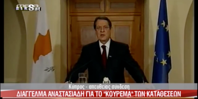Διάγγελμα στον κυπριακό λαό απηύθυνε ο Πρόεδρος της Δημοκρατίας της Κύπρου στις 20:30 το βράδυ. Ο Νίκος Αναστασιάδης σημείωσε πως η Κύπρος ζει τις πιο δραματικές ώρες μετά την εισβολή του ’74 και πως το κούρεμα των καταθέσεων που αναγκάστηκε να δεχτεί αποτελούσε τη λιγότερο οδυνηρή λύση, αφού είχε να επιλέξει μεταξύ αυτού ή άτακτης χρεοκοπίας που θα οδηγούσε στην κατάρρευση ολόκληρου του τραπεζικού συστήματος και, εν τέλει στην έξοδο από το ευρώ. Ανέλαβε το πολιτικό κόστος της απόφασης και δεσμεύτηκε όσοι επιλέξουν ν’ αφήσουν τις καταθέσεις τους στην Κύπρο, να πάρουν ομόλογα συνδεδεμένα με τα κέρδη από το φυσικό αέριο. Τέλος ο κ. Αναστασιάδης έκανε έκκληση στα πολιτικά κόμματα να υπερψηφίσουν αύριο Δευτέρα στη Βουλή το επίμαχο νομοσχέδιο.