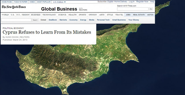 Σύμφωνα με τους NEW YORK TIMES η Κύπρος αρνείται να μάθει από τα λάθη της ενώ τονίζεται ότι έφτασε η ώρα να πληρώσει ακριβά τις αμαρτίες της. Πέρα του γεγονότος ότι “οι Κύπριοι υπερεκτίμησαν την διαπραγματευτική τους ισχύ”, το δημοσίευμα υποστηρίζει ότι το ΟΧΙ της Κύπρου στο σχέδιο Ανάν ήταν αυτό που ουσιαστικά εκνεύρισε τους Ευρωπαίους και όχι μόνο εταίρους με συνέπεια σήμερα να τιμωρείται.