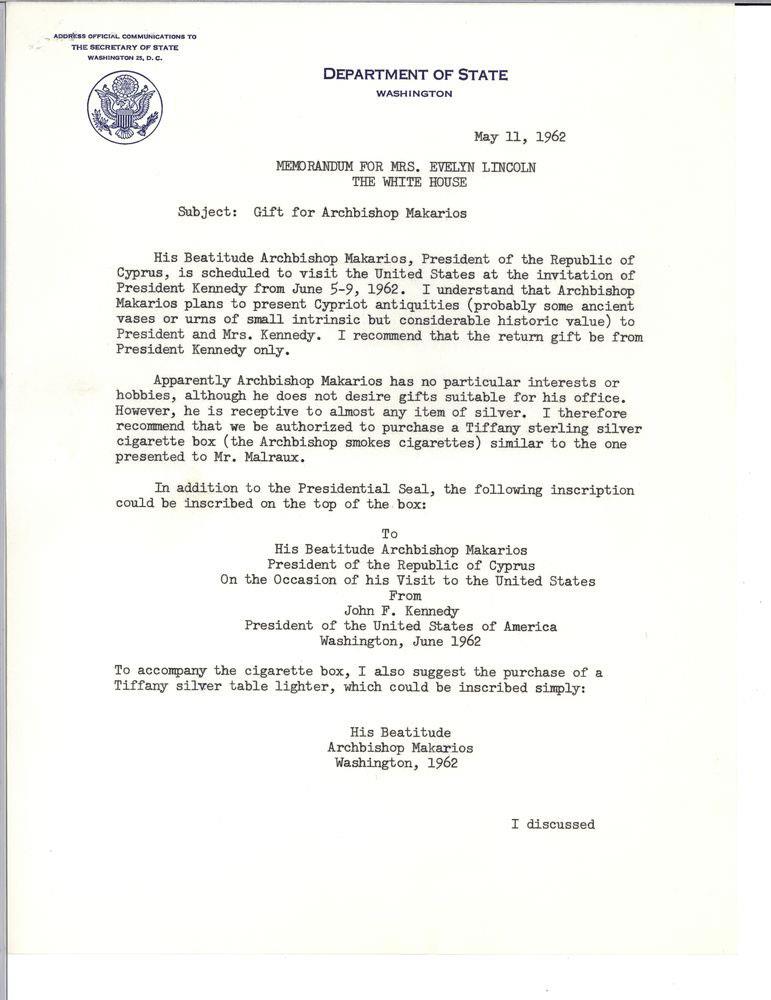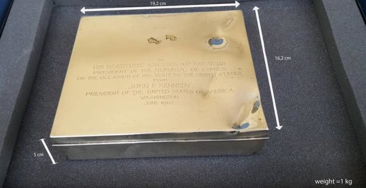 Το δώρο που έκανε ο Τζον Κένεντι στον Aρχιεπίσκοπο Μακάριο κατά την επίσκεψή του στην Αμερική αρχές Ιουνίου του 1962, έρχεται για πρώτη φορά στο φως της δημοσιότητας. Πρόκειται για μία ασημένια τσιγαροθήκη που έχει στα χέρια του ο 98χρονος σήμερα Ανδρέας Χατζηχριστοδούλου.