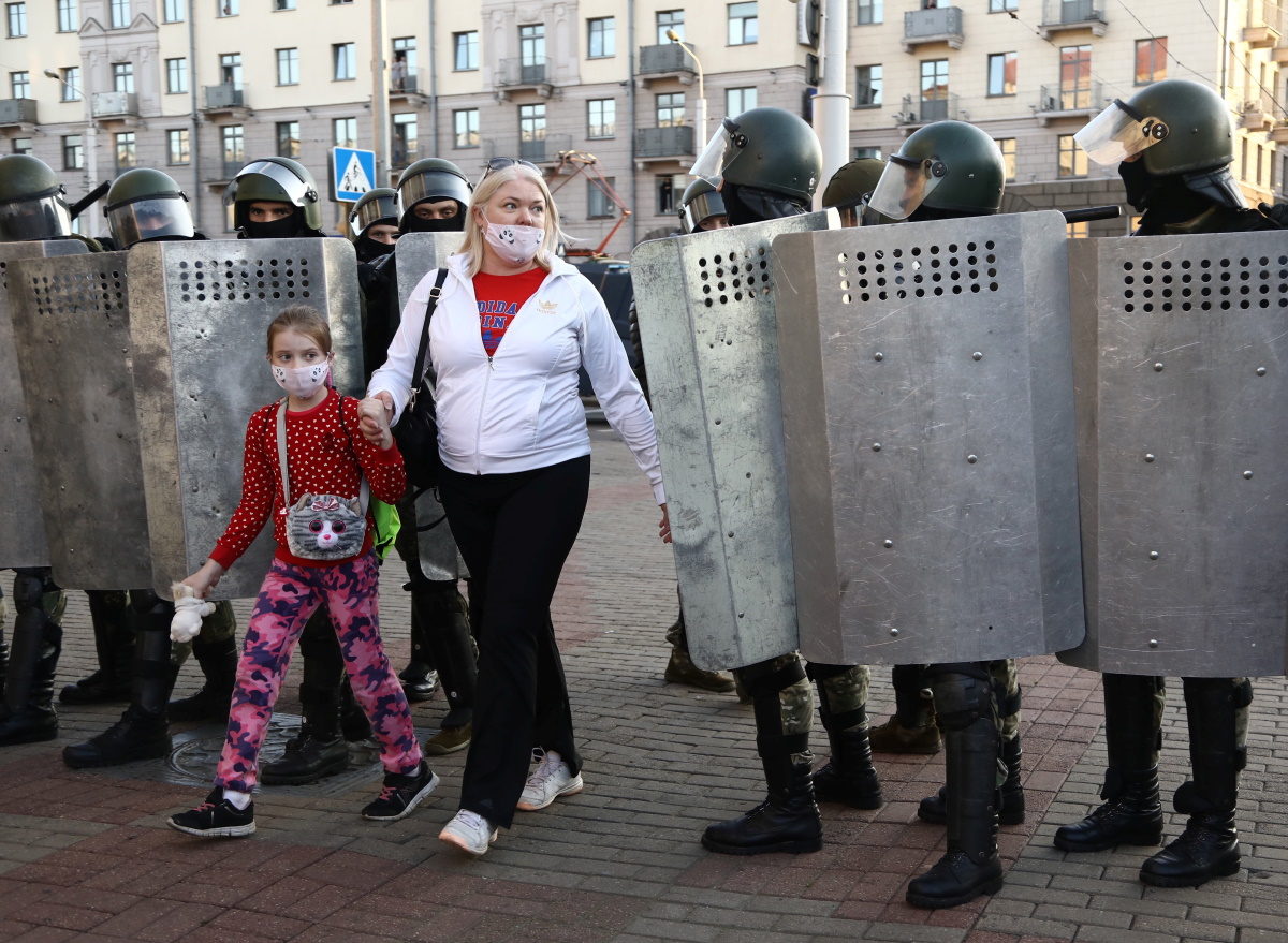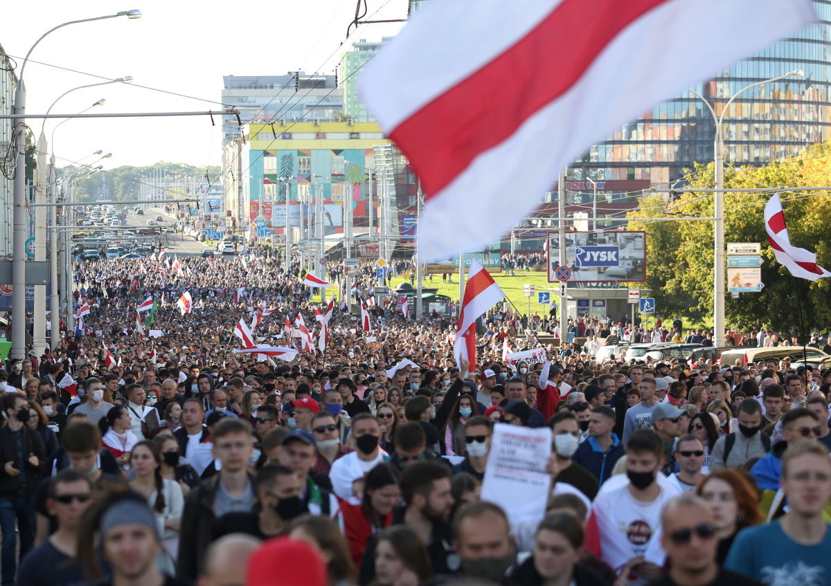 Ντυμένοι στα λευκά και τα κόκκινα, τα χρώματα της λευκορωσικής αντιπολίτευσης, οι διαδηλωτές πορεύθηκαν στην λεωφόρο των Νικητών και κατευθύνθηκαν προς το Μέγαρο της Ανεξαρτησίας, κατοικία του Αλεξάντρ Λουκασένκο.