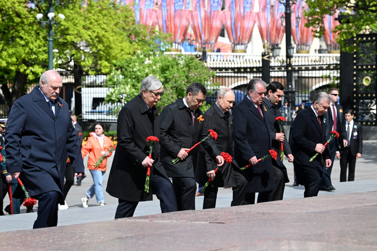Κατόπιν μεταφέρεται με αυτοκίνητο στον Τάφο του Άγνωστου Στρατιώτη, που απέχει μόλις 300 μέτρα, ενώ ο Πούτιν περπάτησε μέχρι εκεί, συνοδευόμενος από τους ηγέτες της Αρμενίας και πέντε χωρών της κεντρικής Ασίας. Ο Λουκασένκο κατέθεσε στεφάνι στο μνημείο, όμως δεν παρέστη στο γεύμα που παρέθεσε ο Πούτιν στη συνέχεια στο Κρεμλίνο.